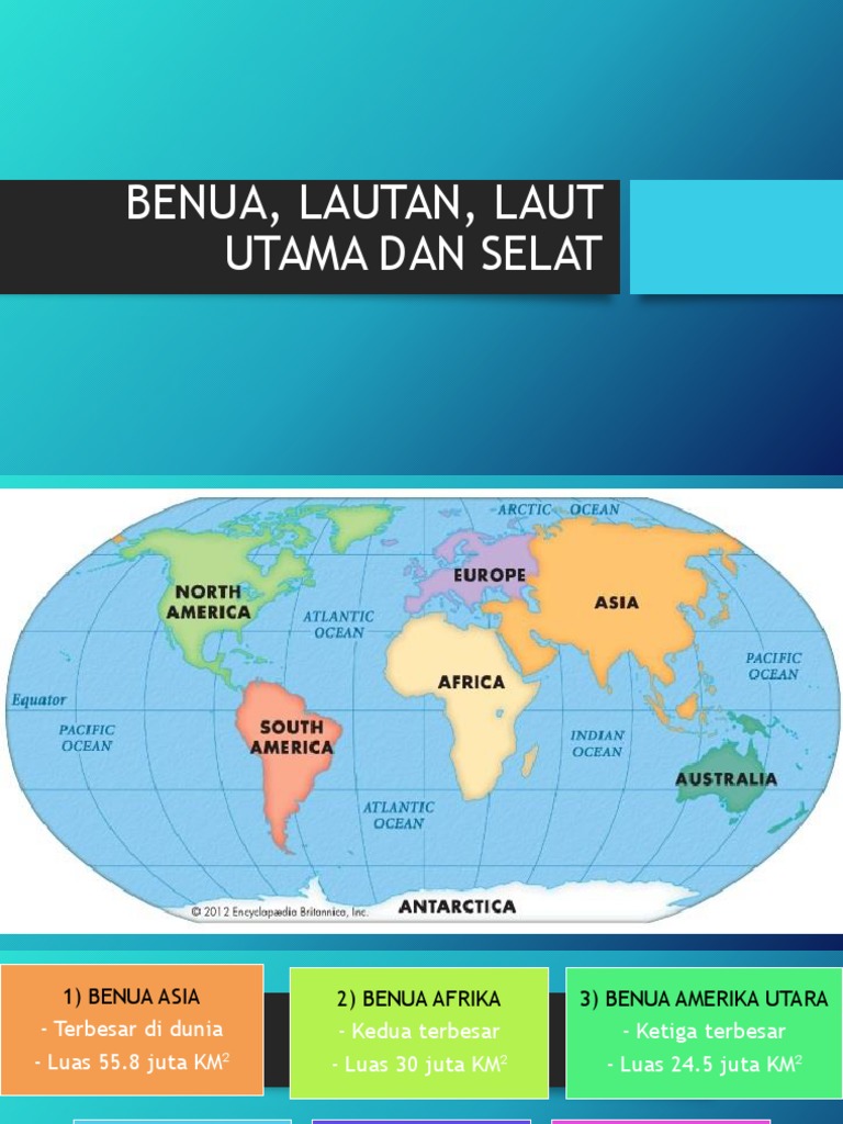 Laut paling hangat di dunia adalah Samudra Hindia. UTAMA DAN SELAT 1 BENUA ASIA 2 BENUA AFRIKA 3 BENUA AMERIKA UTARA - Terbesar di dunia - Kedua terbesar - Ketiga terbesar - Luas 558 juta KM - Luas 30 juta KM - Luas 245 juta KM. Benua Lautan Laut Utama dan SelatTerdapat 7 buah benua di dunia1.